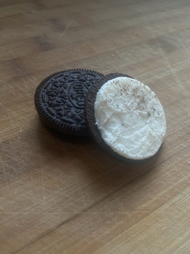 I also began to think about the middle and realize that when it comes to food, the middle is almost always my favorite part. If we are having brownies, I want the gooey middle piece (if you’re one of those monsters who buys the only edge piece brownie pans, I just beg you only make that for yourself and consider the rest of us if you’re bringing that to a potluck). While the crusty outside of a piece of bread is wonderful, I am always heading into the soft inner area to savor. And yes, the middle of an Oreo is where I want to be.